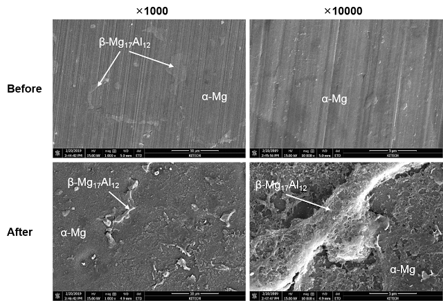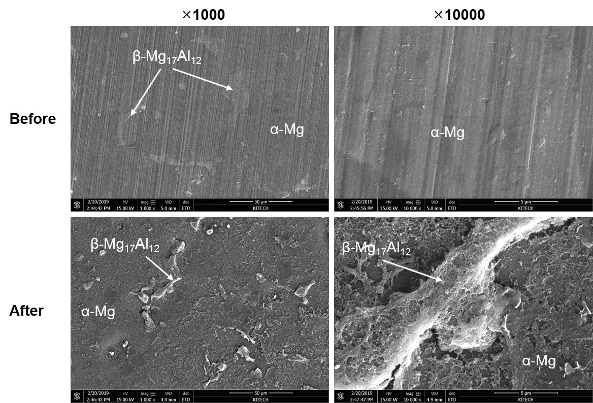 Hình 1. Cấu trúc vật liệu Mg AZ91 trước và sau quá trình tiền xử lý, bao gồm 2 pha alpha chứa chủ yếu là Mg và beta chứa Mg17Al12.